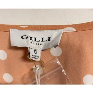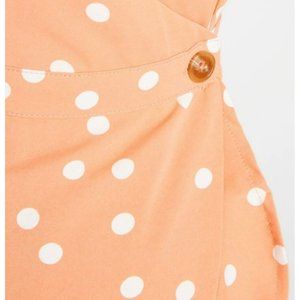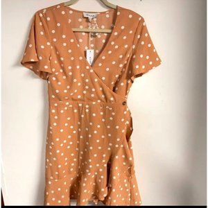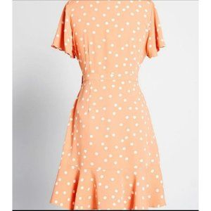 New with tags. Gilli Going with the flow polka dot wrap dress from Modcloth size women’s small. Peach colored dress has ruffled hem, v-neck with a snap closure, and a button detail at the waist. Fully lined. From a smoke free pet friendly home.