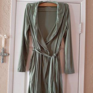 The robe is a size XS/S. It is made of 65% polyester and 35% rayon. It is full sleeves and the length is 38"s from shoulder to hem. It has a waist tie. It is a beautiful fern green. It is brand new, never worn. Ultra soft.