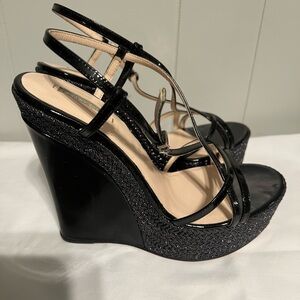 Almond Peep-Toe Wedge Dress, Patent Leather Sandals by Giorgio Armani. Made in Italy