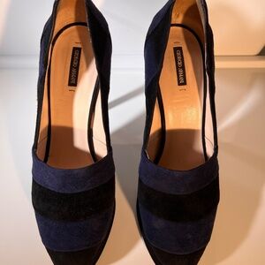 New and 100% Authentic Almond Peep-Toe Wedge Dress Sandals by Giorgio Armani. Made in Italy