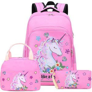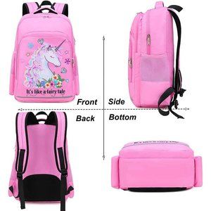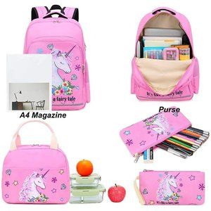 Quantity: 3 pieces, Including Girls unicorn backpack + Insulated Lunch tote bag + pencil pouch, All bag are printed a fairy unicorn, large capacity, multiple pockets, fits 14"laptop/ Mac and accessories, 3" binder/folders, school textbooks and supplies, etc.