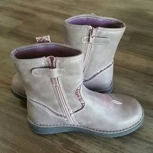 Cute taupe brown boots with pink glitter accents. Pink contrast stitching with decorative side buckle. Zip up side. Size 1. Never been worn.