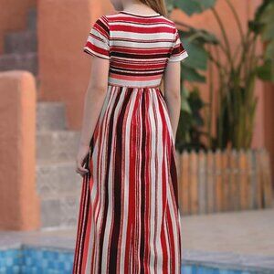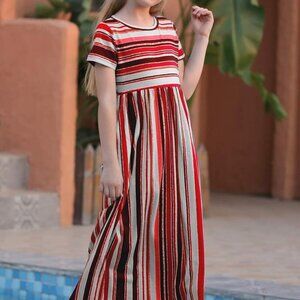 New Girl's Floral Maxi Dress in Red Stripe Print — A fun, flowing style for special days or everyday adventures.