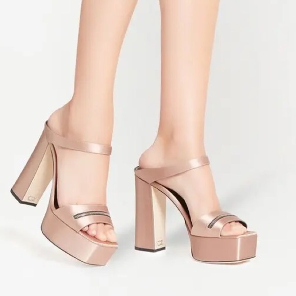 rose pink satin finish decorative zip detailing open toe ankle strap branded insole platform sole high 120mm block heel