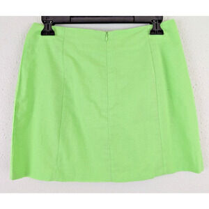 Size 6 USA, mini skirt, bright green, not stretchy, zips up the back, lined, slit at front, no pockets, thin, lightweight