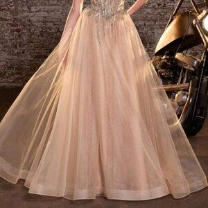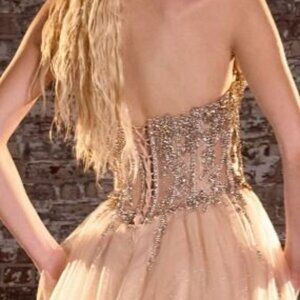 New Gold Strapless A-Line Tulle Beaded Dress w/ Lace Up Back & V-Neck CD721