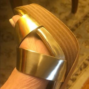 Gorgeous brand new in original box, Coach shiny gold leather high heeled platform sandals in original box. Beautiful with fancy dresses or to be worn casually for a night out. A steal at this price.