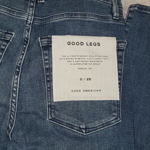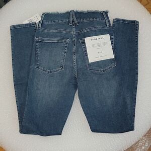 Good American's best-selling high rise, skinny fit stretch jeans in a classic medium blue wash. The Good Legs Fray Waistband is made with a gap-proof contoured waistband and a high waist that's sure to flatter every curve.