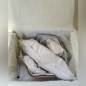 👠 New Good American Open Square Toe Heels Silver Snake Size 4