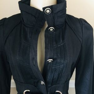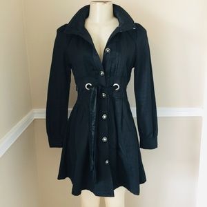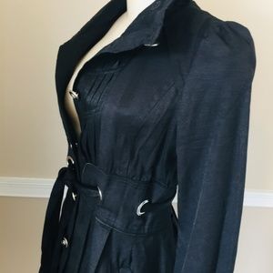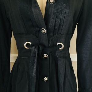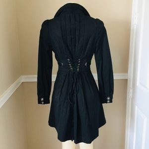 Beautiful stylish trench style coat/dress with amazing details. Beautiful buttons and satin tie at the waist. Lift the collar for a different look. Corset style design in the back. Has side pockets. Gorgeous piping detail all around. Worn once