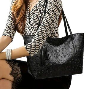 New Goth Skull Print Black Tote Purse Handbag All Over Embossed PU Leather Roomy