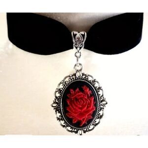 Gothic Style Black Velvet Choker With Oval Shaped Red Floral in Relief Pendant. So sweet and on trend, super coo too! Bundle and save on lots of cute accessories in my closet!