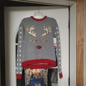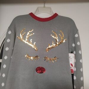New with tag great christmas sweater size women's XL. It is gray and red gold sequin red sequin nose armpit to armpit 21 inches 22 inches long.