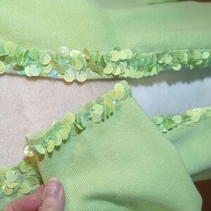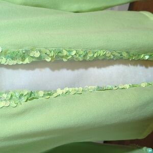 Chic light pistachio green hook and eye closures down front front short trimmed in showgirl like paillettes accents. Ideal for layering.