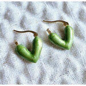 New Green Enamel & Gold Tone Puffy Heart Retro 80s Style Huggie Hoop Earrings