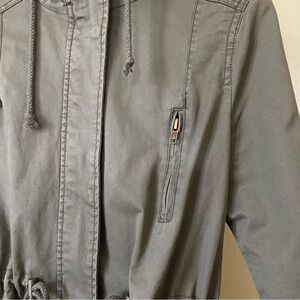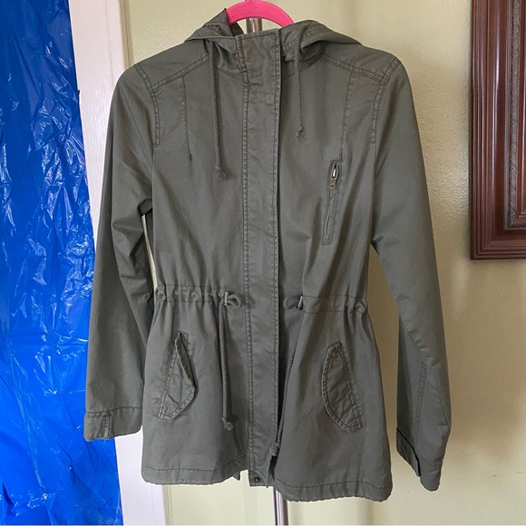 Chic khaki utility jacket with hood. Features drawstring waist and front pockets. Ideal for casual wear.