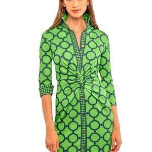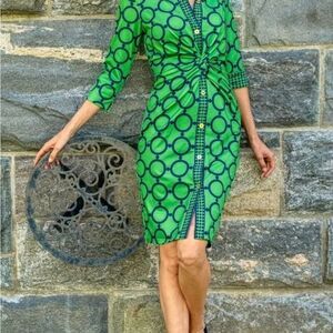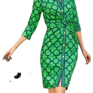 Green and navy button down dress Stylish green dress with a unique pattern, perfect for any occasion. Comfortable and chic, this dress is a must-have for your wardrobe.