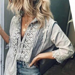Bohemian Grey Lace Button Front Blouse