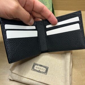 Elevate your style with this authentic Gucci men's wallet, crafted in Italy from premium black leather. The wallet features the iconic GG monogram pattern, adding a touch of luxury to your everyday accessories. Designed with a modern bifold style, this wallet is both sleek and practical, perfect for organizing your cards and cash.