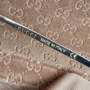 New. Unisex. Gunmetal frames. Low profile frames that almost look frameless. Light amber lenses. Measurements lens/eye 56mm, bridge 14mm, temple 140mm. Stamped “Made in Italy”. Includes case & polishing cloth.