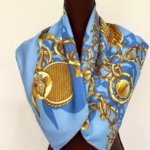 Authentic New Gucci Logo Chains Sky Blue Gold Silk Scarf with Gucci Gift Box