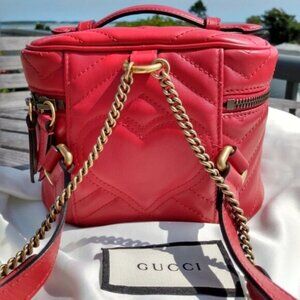 Features: Long adjustable leather and gold chain straps with functional and fun train case design. Solid Gucci engraved double zipper closure protects your valuables in style.