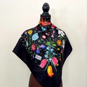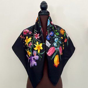 Authentic New Gucci Iconic Floral Print Multicolor Silk Scarf with Gucci Gift Box New with a tag 100% silk twill Multicolor with Black background Square shape Size 35" x 35" inches Hand stitched rolled edge Gucci Logo on the bottom Style # 022796 Made in Italy The scarf comes in a Gucci box, making it a perfect gift. Shipping next business day. Usually arrives within 2-3 business days. How to Wear a Silk Scarf: As a silk head scarf/bandana: tied around as a silk head wrap for a classic look or over ponytail. As a neck scarf: wear it around the neck - tie a bow or let the end hang loose. As a top: wrap around your body to make a beautiful silk tube top, tie it in the front or at the back, paired with jeans. As a silk belt: wear around high-waisted pants. As a silk scarf for bag: tie around or to the handle of your favorite bag for a classic look. Style it any way you want in your own mood and creativity!