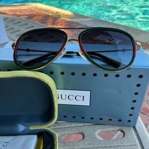 Stylish Gucci sunglasses with bold green and red accents. Perfect for a modern look. Experience luxury with every wear.