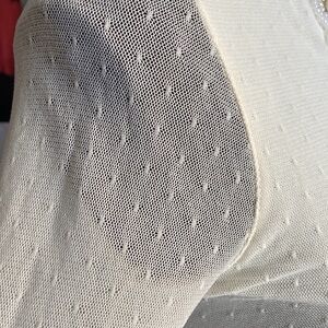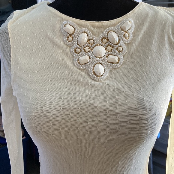 Color: milky white • Dotted-mesh dress. •Rounded neckline. •Long sleeves. •Fit-and-flare silhouette. •Mesh upper with beaded embellishments. •Side cutouts at waist. •Contrasting flare skirt. •Center back zipper with hook-and-eye closure. •Lined •Body: 98% nylon / 2% spandex •Slip: 100% polyester