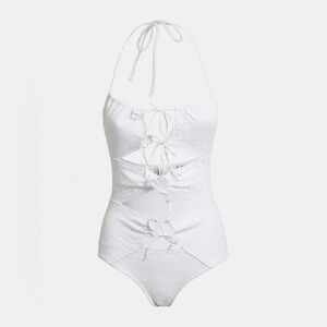 A charming summertime option, this one-piece swimsuit is made in a Sangallo lace fabrication with tie-front closures and halter neckline.