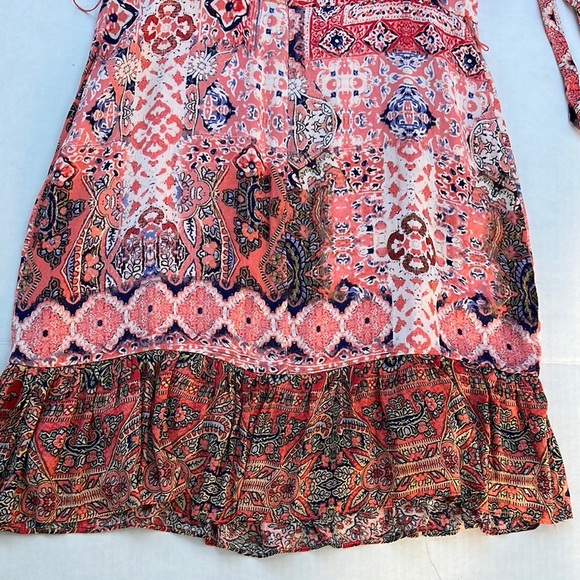 This sleeveless sundress by Guess features a playful ruffled and tiered design in vibrant orange and pink hues. With its spaghetti straps and mini length, it's perfect for casual resort wear, offering a breezy and stylish look for warm weather.