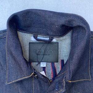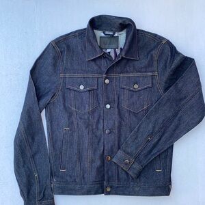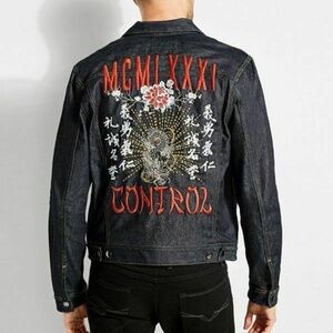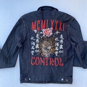 Long sleeve 6-button up denim jacket with spread collar and barrel cuffs 2 chest pockets, 2 front pockets Large embroidered design on back that includes flowers, dragon, and text that says, "MCMLXXXI CONTROL" 98% Cotton, 2% Elastane Machine wash