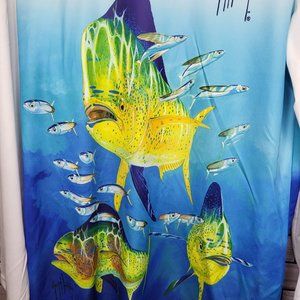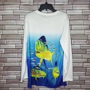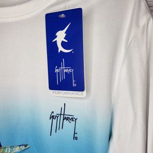 New shirt for boys by Guy Harvey. Youth boy's SIZE XXL. The top is white with green and yellow fish with a blue background. It has white long sleeves with GUY HARVEY in blue down one of them. The back and front of the shirt have the same designs. It has special features of stretch fabric, UPF 30, and moisture wicking. The shirt is NEW WITH TAGS. Made of 100% polyester and is machine washable. Great for any day of the week next to the water or any casual event. See pictures for details. Message with any questions.