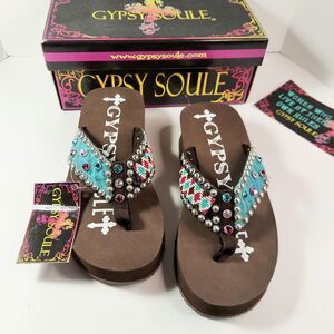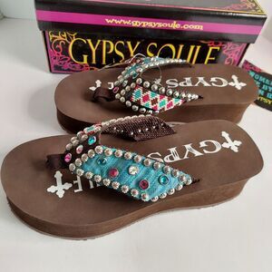 New Gypsy Soule Flip Flop Sandals Swarovski Crystals Sz 10 Brown Blue Aztec Box