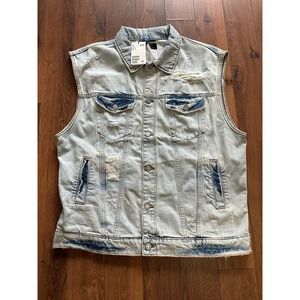 New H&M Denim Vest with Printed Design Light Distressed denim Men’s Sz Lg