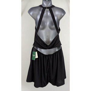 size XL, one piece, romper shorts dress, has pockets, knit material, fastens at neck, elastic waist, not padded and black in color.