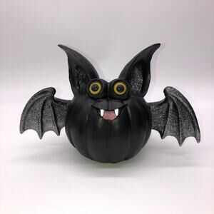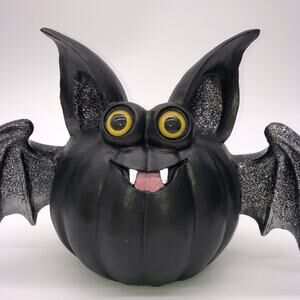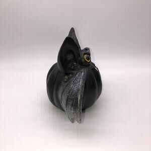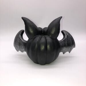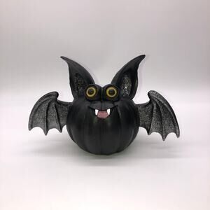 New black vampire bat pumpkin with glitter wings and ears. Measures approx 8”h x 12”w.