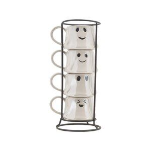 Way To Celebrate Halloween Espresso White Ghost Stoneware Stackable Mug Set with Iron Rack