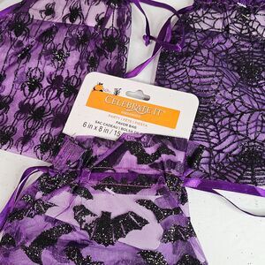 Set of 3 new Celebrate It brand organza and glitter Halloween party favor bags. Measure 6" x 8". Purple background with black bats, spiders, and spiderwebs.