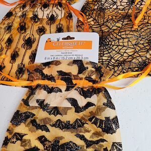 Set of 3 new Celebrate It brand organza and glitter Halloween party favor bags. Measure 6" x 8". Orange background, one with black bats, one with black spiders, one with black spiderwebs.