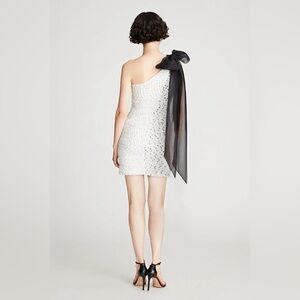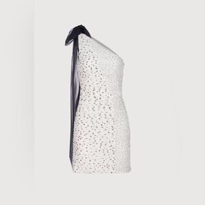 The Analise minidress from Halston showcases a mix of polka-dot prints in a ruched design. A cascading bow finishes this chic look. This is such a stunner and will turn heads at any event- don’t miss out on this beauty!