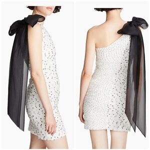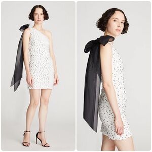 New! Halston Ruched Polka Dot Cocktail Dress with Long Bow Analise🖤🤍 sz 6 NWT!