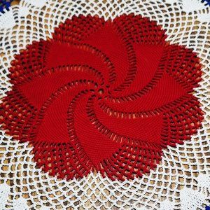 You can be purchasing a new beautifully stitched Victory Red pinwheel with White, and Royal Blue trim, 17" doily for your patriotic decor. The doily is hand crocheted using Aunt Lydia's size 10 crochet cotton thread. Pre-washed, blocked and starched to shape. Washing instructions are included with doily in shipping.