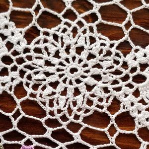 You can be purchasing a new beautifully stitched 25 1/2" x 15" oval Pineapple doily with Monet Multi color pineapples with 2 White pineapples in the center and trimmed with white. The doily is hand crocheted using Aunt Lydia's and Red Heart size 10 crochet cotton thread. Pre-washed. Blocked and starched to shape. Washing instructions are included with doily in shipping. Created in smoke free environment.