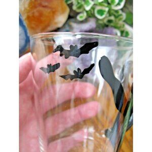 New Hand Painted Black Cat & Bats Clear Glass Tea Coffee Mug Cup w/ Tail Handle