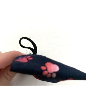 Navy material with pink, purple, and blue paw print and heart polka dot pattern.