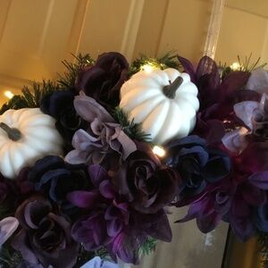 New Handcrafted 18 inch Wreath with lights featuring colors of white, Deep Navy Blue, Purple/Burgundy, and gray. Beautifully Unique. One of a Kind! Measurements are approximate.