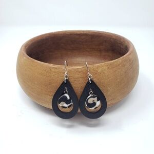 Black, tan, & ivory animal print fabric button in a silver setting made from an upcycled shirt. The button sits in the middle of a tear drop shaped wooden dangle earring.