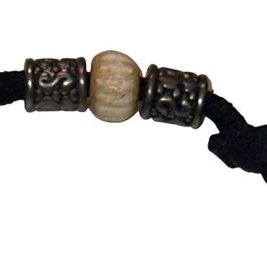 The Handmade Black Single Strand Cord Toggle Clasp Beaded Station Necklace features a sleek black cord adorned with silver-tone textured patterned beads spaced throughout. The beads add a striking contrast to the simple cord, offering a touch of elegance. The toggle clasp ensures easy wear, making this necklace a versatile and stylish accessory for both casual and formal outfits.