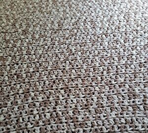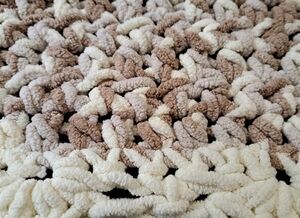 new condition, so soft & comfy, colors are cream, tan & grey, scalloped edges, can be put on the bed or over the sofa, no noticeable flaws, one of a kind (see video)